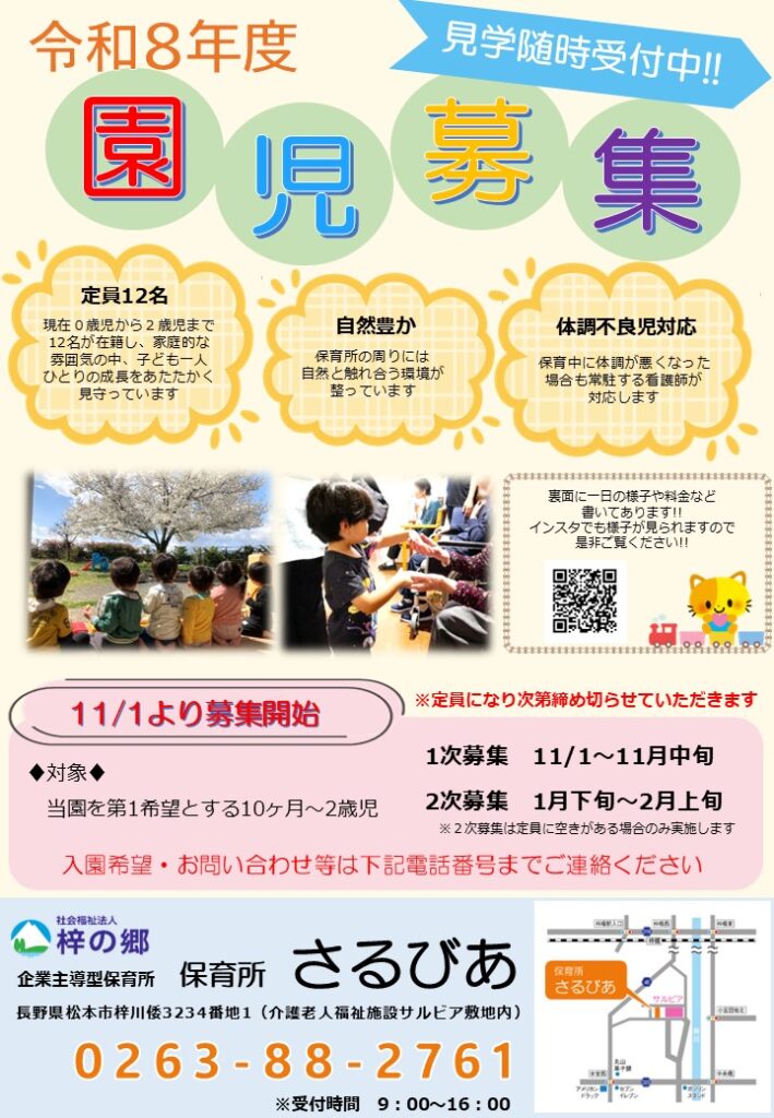 保育所さるびあにおきましても、11月1日から令和8年度の園児募集を開始いたします。