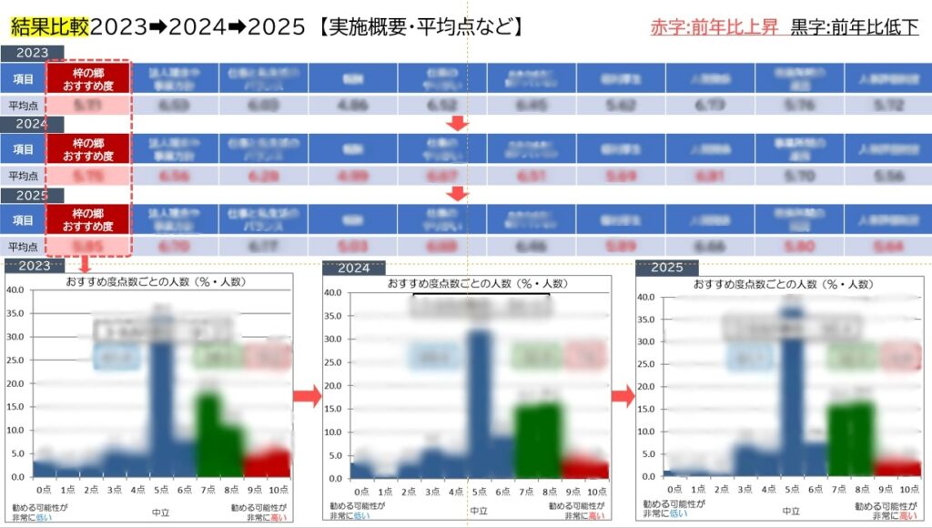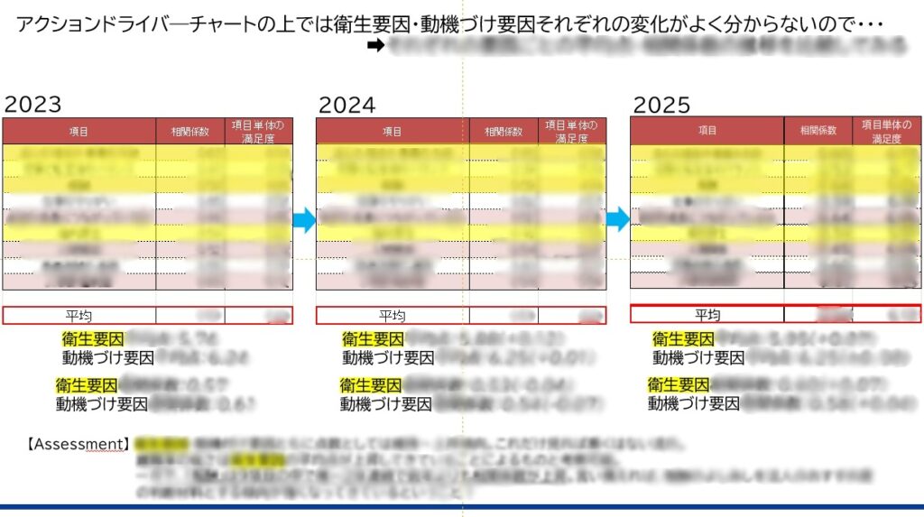 eNPSやアクションドライバ―チャートについては3回目となることでようやく経年変化分析ができるようになってきましたし、今年からはハーズバーグの二要因理論の視点を取り入れてみることで新たな考察にもつながってきています。